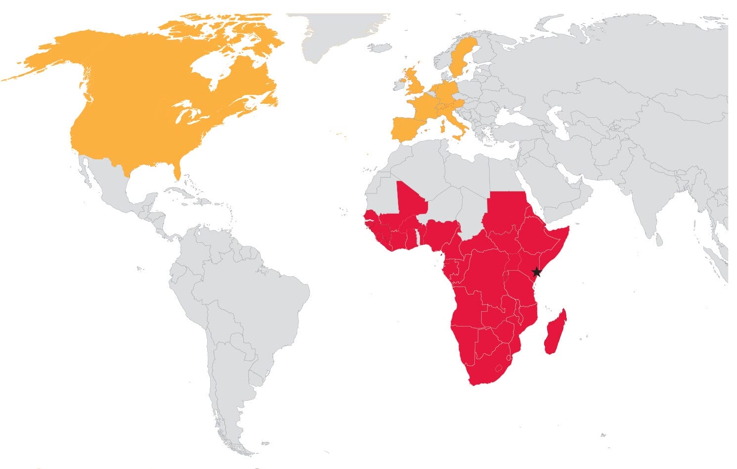 La rete internazionale di Amref è oggi attiva in 37 Paesi africani con più di 130 progetti di promozione della salute. Oltre agli uffici nazionali e regionali in Africa, Amref possiede 11 sedi in Europa, Stati Uniti e Canada, impegnate in attività di sensibilizzazione, advocacy e raccolta fondi.
