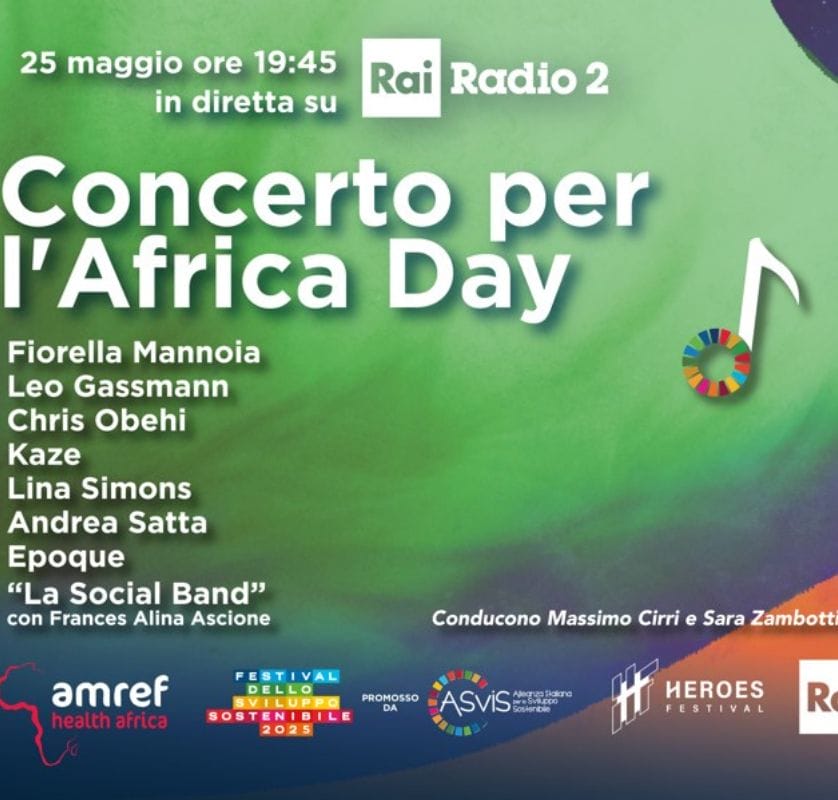 Rai Radio festeggia l’“Africa day” con un concerto in onda domenica 25 maggio dalle 19.45 alle 21.30 in diretta su Rai Radio2 e sul canale 202 del digitale terrestre, condotto da Sara Zambotti e Massimo Cirri.