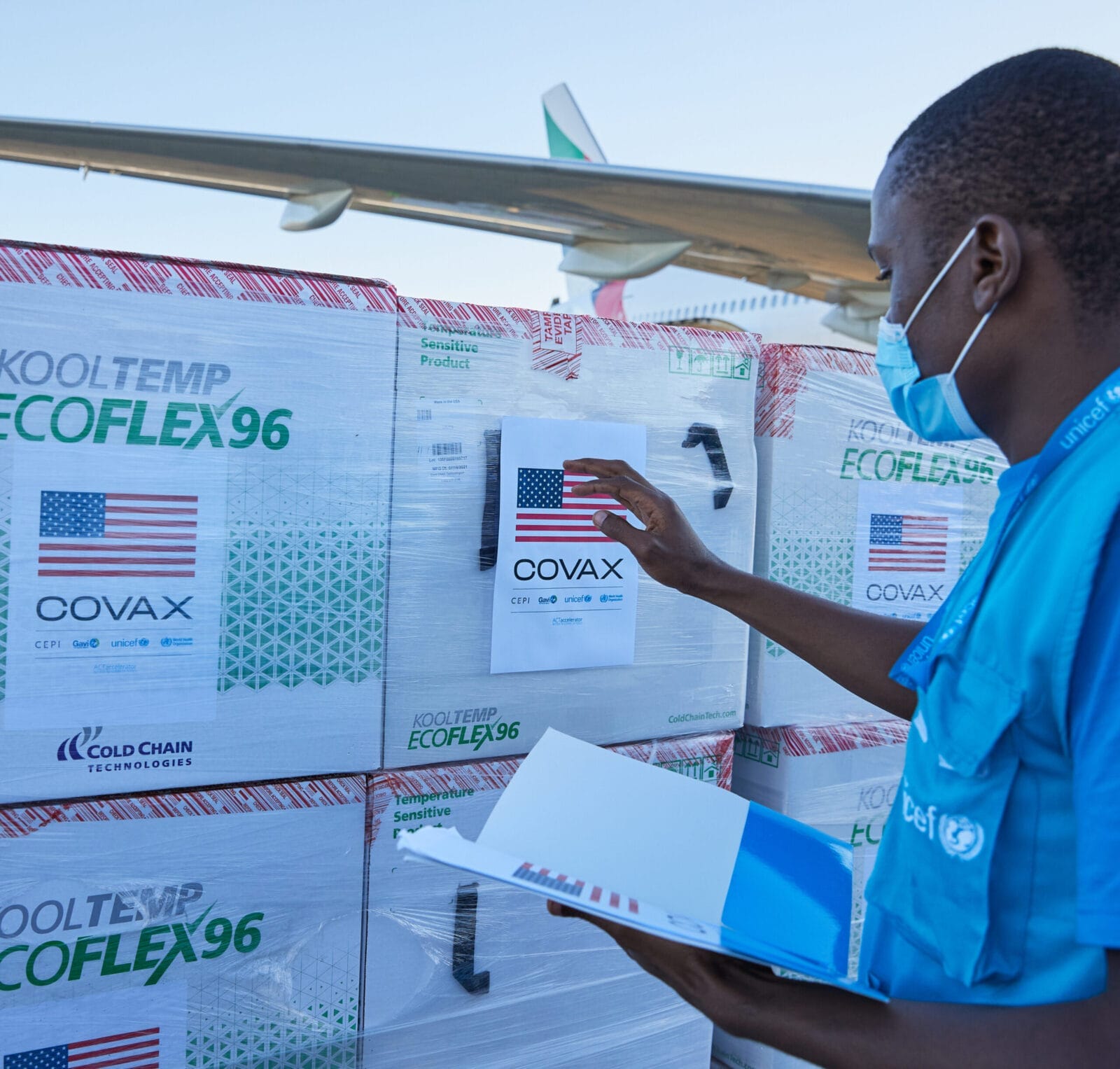 La mattina del 23 agosto 2021, 880.460 dosi del vaccino Moderna anti-COVID-19 sono arrivate all’aeroporto internazionale Jomo Kenyatta, a Nairobi, Kenya. I vaccini – che costituiscono la prima di due spedizioni, per un totale di 1,76 milioni di dosi – sono stati donati dal governo degli Stati Uniti tramite l’iniziativa globale COVAX e trasportati dall’UNICEF.
