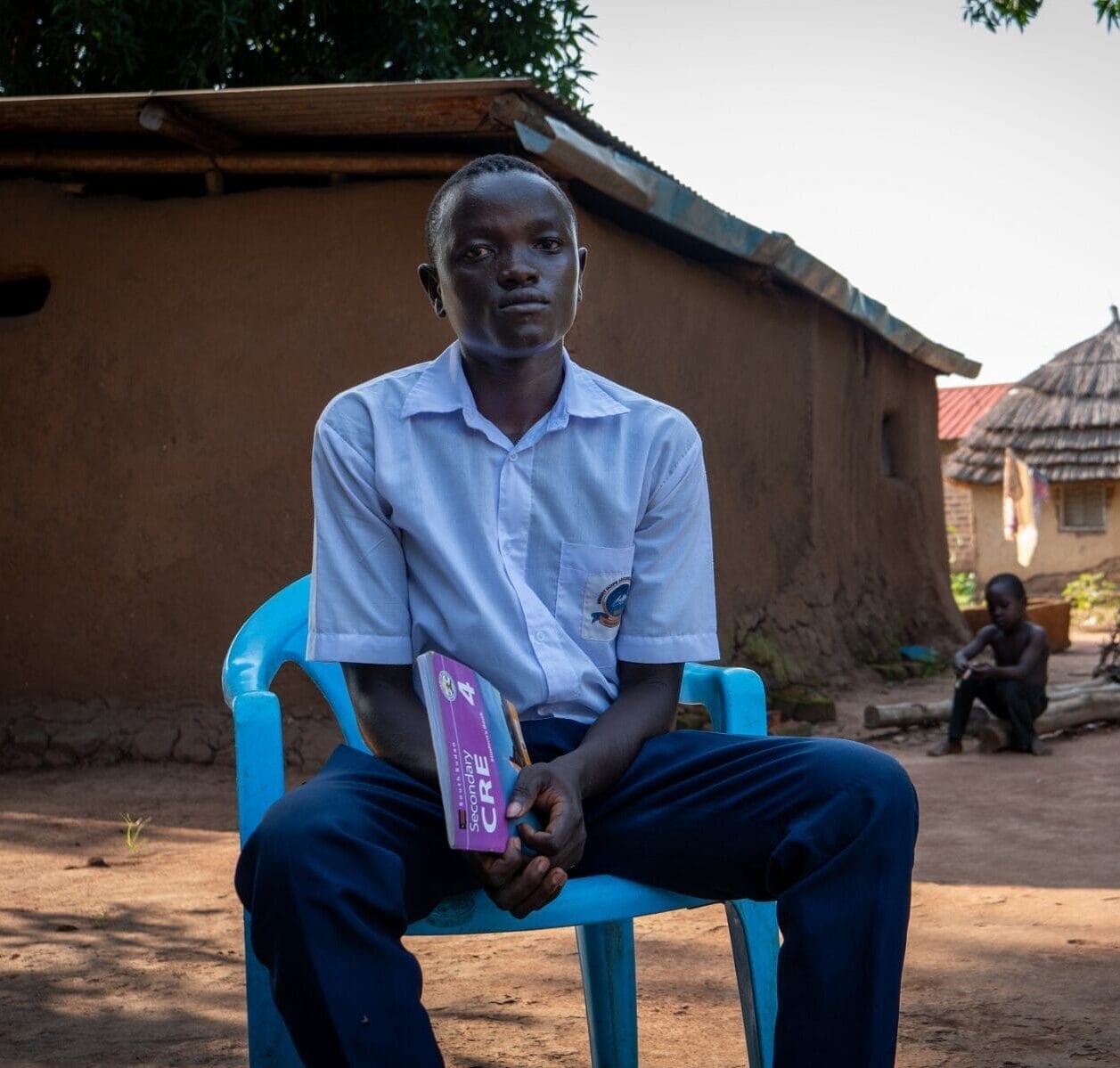 Seduto accanto a sua madre Florence, Zakayos Emmanuel, ventenne, indossa una divisa scolastica molto ordinata e tiene sulle ginocchia un libro di testo del Senior 4, l’ultimo anno di scuola superiore in Sud Sudan.